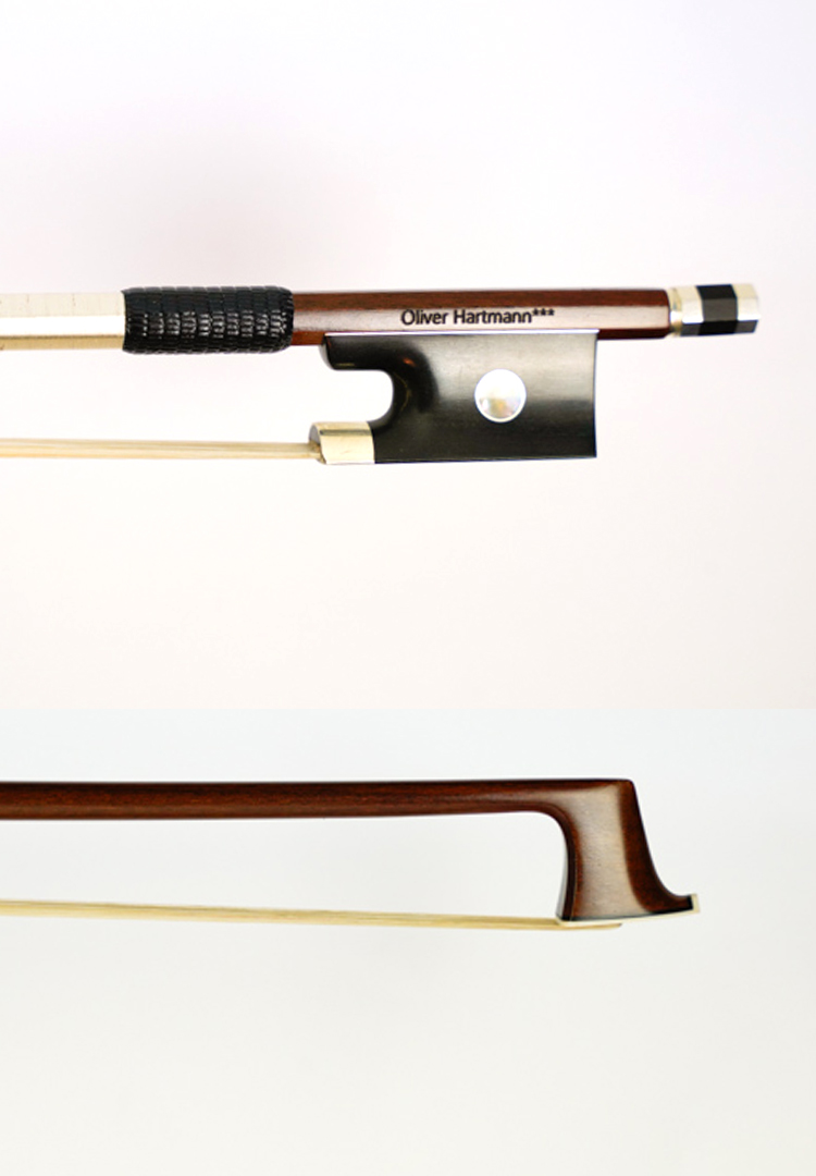 2460 NEW 4/4 Violin Bow. Pernambuco round stick. Branded: ‘Oliver Hartmann***‘. Silver mounted ebony frog with Abalone Parisian eye and slide. Three part button of ebony and silver.